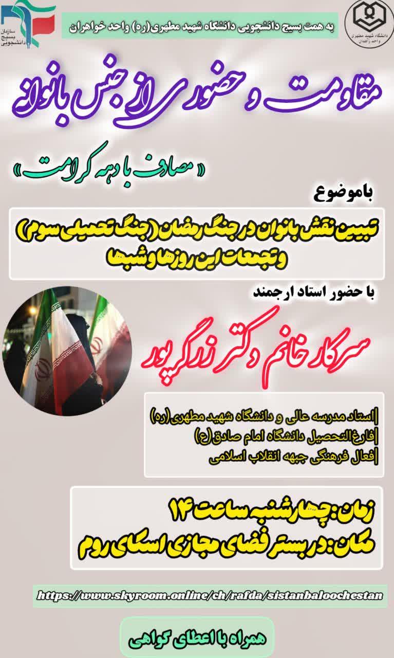 به مناسبت دهه کرامت بسیج دانشجویی واحد خواهران دانشگاه شهید مطهری (ره) زاهدان برگزار میکند: